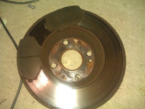 Drivers side was a different story. The wheel was hard to turn in places, suggesting some kind of warpage on the disc. It certainly didn’t seem to be running true. Upon removal, it certainly appeared that something wasn’t right. One of the pads was roughly half worn as expected, but the other was nearly completely finished. It also hadn’t worn evenly – I’m wondering if the caliper is up to scratch.