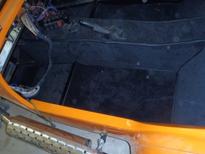 So with the right holes in the floor pan the carpets could be fitted. The rear carpet was first, then the finishing strip then the tunnel carpet. The tunnel carpet had already had the handbrake and gear lever gaitors sewn in thanks to my partner’s mum. Glad I didn’t have to do that! It just needed further trimming for the fuse box and where the rear loom comes through the tunnel.