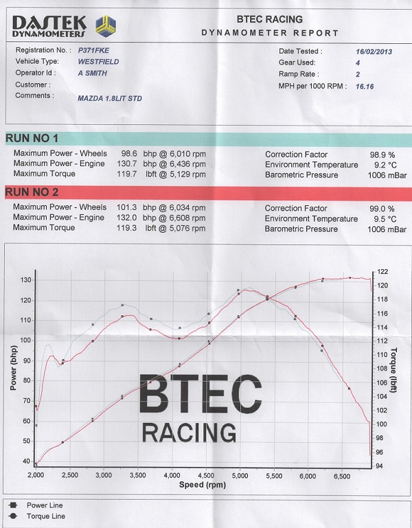 Standard MX5 power is 133, so only one of mine has become lasagne. That’s not bad, and a shame really. I was all set to replace the engine to save fixing the coolant leak but as it’s giving good power I don’t think I should write it off, even after 144,000 miles! So at some point, assuming I ever get around to it I’ve got to pull the engine and get the block skimmed. A Westfield manifold will make an appearance some time soon and I’m tempted to fit an induction kit to replace the standard air box. It’d be interesting to see what kind of difference that makes.
