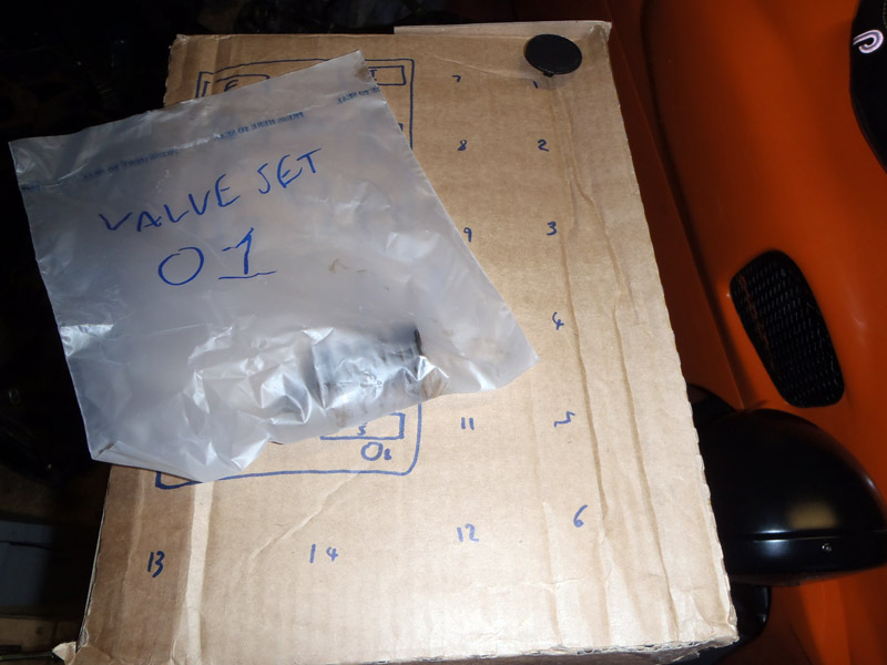 I later found out that no only was I incapable to getting the numbers 1-8 down the length of the box, I was also unable to count all the way to 16. Oops! I popped the spring, retainer and collets into a sandwich bag and slotted the valve into the box. I also wrote the valve number on the carbon of the valve as extra security. It should brush right off when I clean the valve up for refitting.