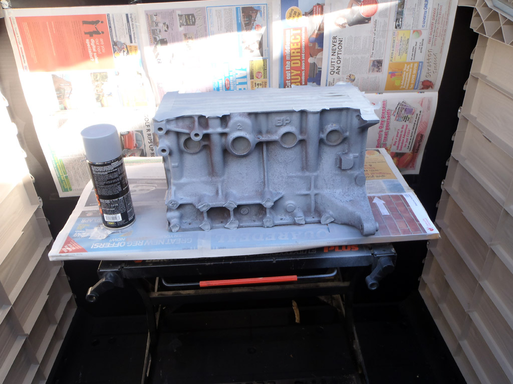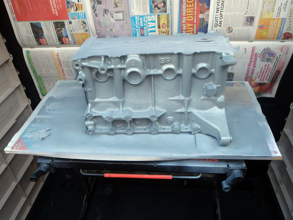With the inspection of Paul’s handiwork done (think I was more interested in how clean stuff was!), I popped the block back on the workmate, masked it up then applied the primer. I’m using VHT Engine Enamel paints as opposed to the POR15 stuff from last time. This is simply due to the colour range and the fact that they’re aerosols rather than brush on. I’ve got the 3 stages – primer, colour and clear coat.