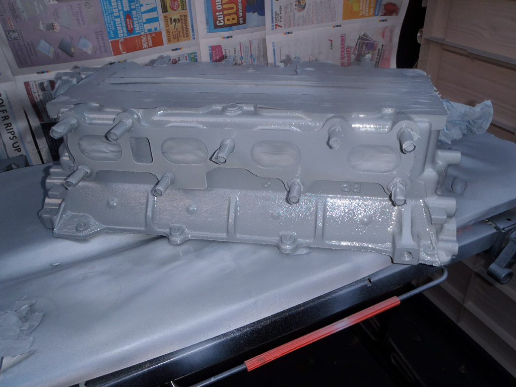 After more masking than the block required, I got the head painted today. I’ve not taken any step-by-step photos though, largely because it appears very similar from when the primer is finished to when the clear coat is applied.