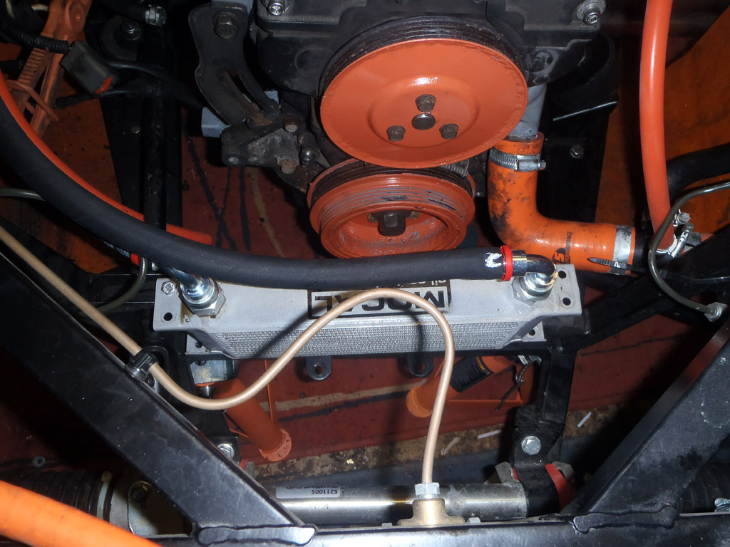 First up was to decide where the oil cooler was going to go. Luckily I noticed that the cooler itself fitted exactly between two unused brackets. I’m not sure what they would have been for originally, it might even be for an oil cooler.