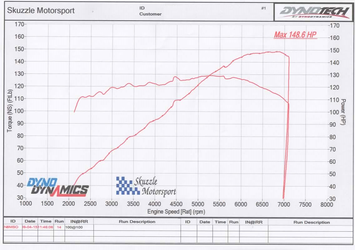 That’s 148.6bhp at the wheels, or around 167-170 at the fly. I’m quite pleased with that result, I was only expecting around 150 at the fly and I’ve pretty much gotten that at the wheels. The shape of the graph is also pretty good. There’s a minor dip just after 5.5k rpm which Nick suggested as most likely a misfire. He recommended trying iridium plugs so I’ll give them a go.