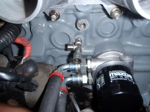 I also found some motivation from somewhere to fit the oil feed pipe. This comes from the pressure sender port on the other side of the block. I popped off the throttle bodies and removed the current pressure sender and adaptor. I then assembled the T-piece that came with the kit, using a small amount of PTFE tape. For each join I double checked that there was a good enough connection for the pressure sender to earth to.