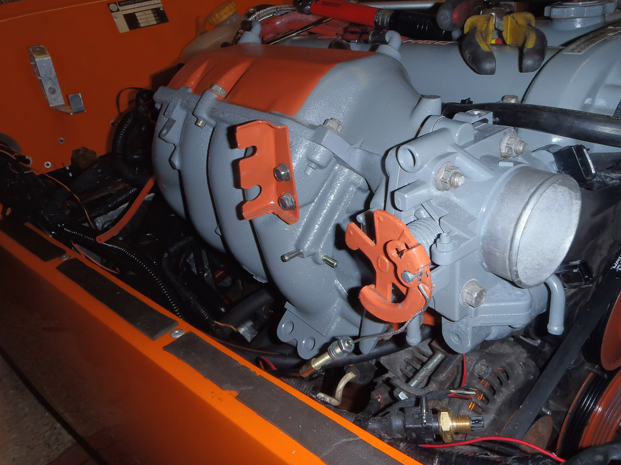 I painted the inlet manifold grey and orange to match the engine, but it’s not turned out as well as I’d hoped. The curse of not planning ahead! The orange section on top of the manifold is supposed to house a sticker which I’ve not chosen yet, but the orange bracketry hasn’t worked well at all. Looks a bit… fisherprice…