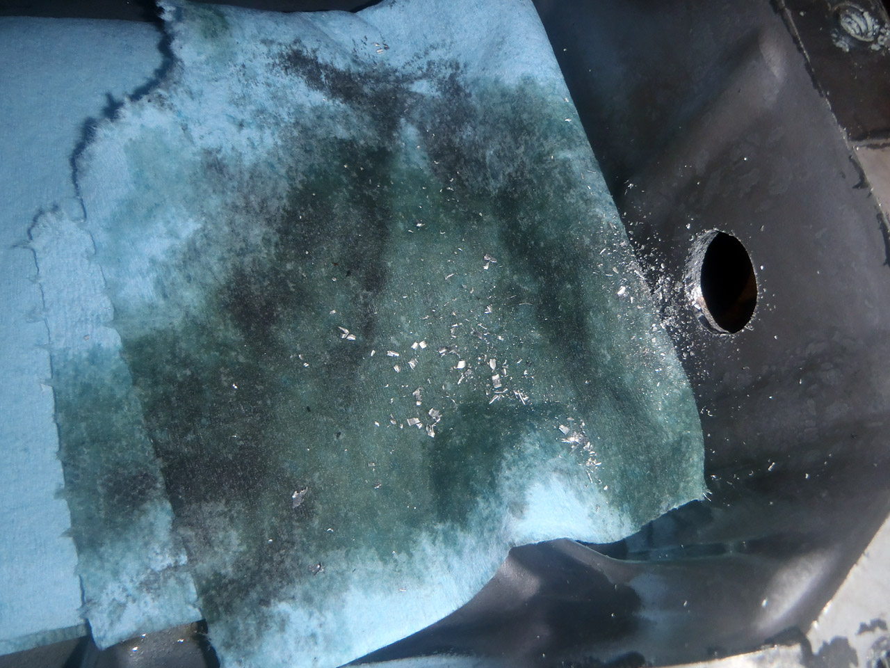 As expected, this had put a lot of swarf in my sump. In a bid to catch it, I’d lightly oiled a bit of tissue in the hope that most of the swarf would stick to it. Here it was after the first hole: