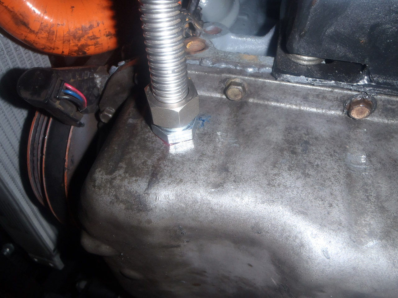 Ok, sump is back on, and it wasn’t too bad. Initially I was worried that it wasn’t going well, I just couldn’t get the corner the drain fitting was in to sit flush with the engine. Then I realised I had trapped the drain hose in between the sump and the block. Oops!